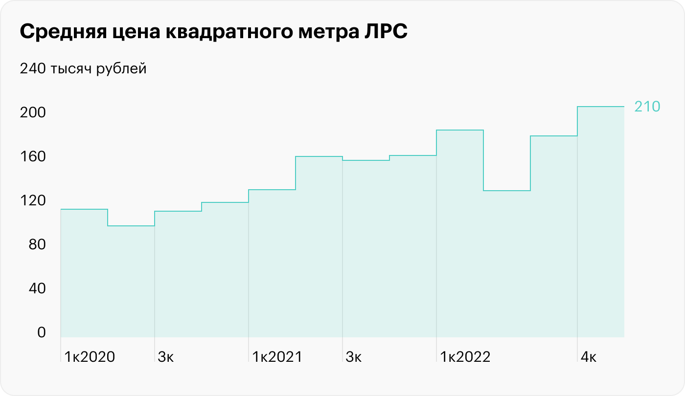 Средняя цена квадратного метра у ЛСР за год увеличилась на 27% — с 165 до 210 тысяч рублей.