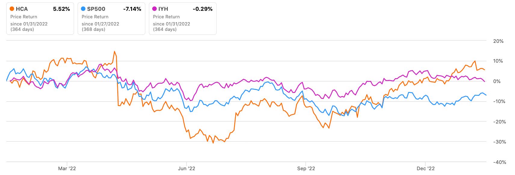 Динамика доходности акций HCA HealthCare по сравнению с iShares U.S. HealthCare ETF и индексом S&P 500 за последние 12 месяцев
