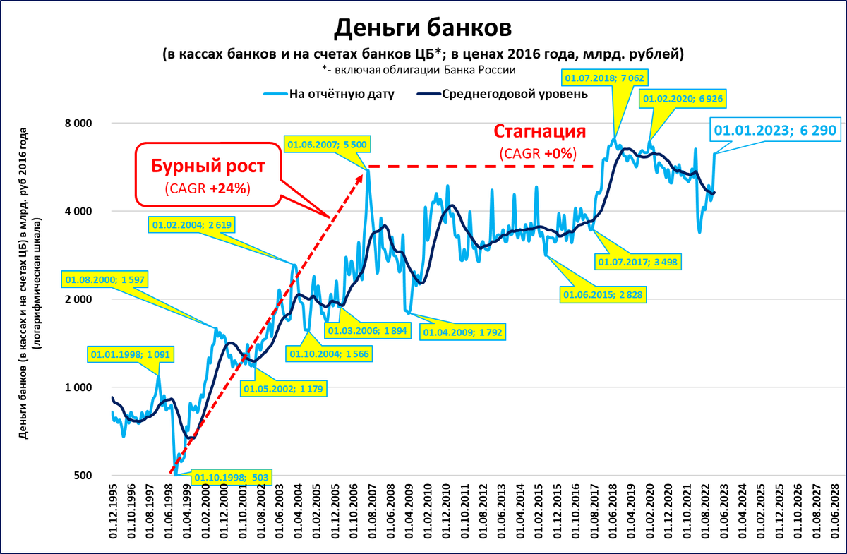 Более того, реальные деньги банков сейчас (6,3 трлн в ценах 2016 года) близки к значениям июня далёкого 2007 года (5,5 трлн).