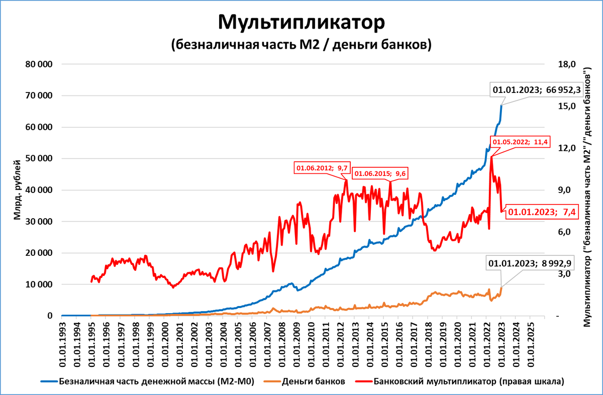 Снижение мультипликатора говорит о том. что у банков появляется возможность смелее наращивать безналичную денежную массу, в том числе путём кредитования.