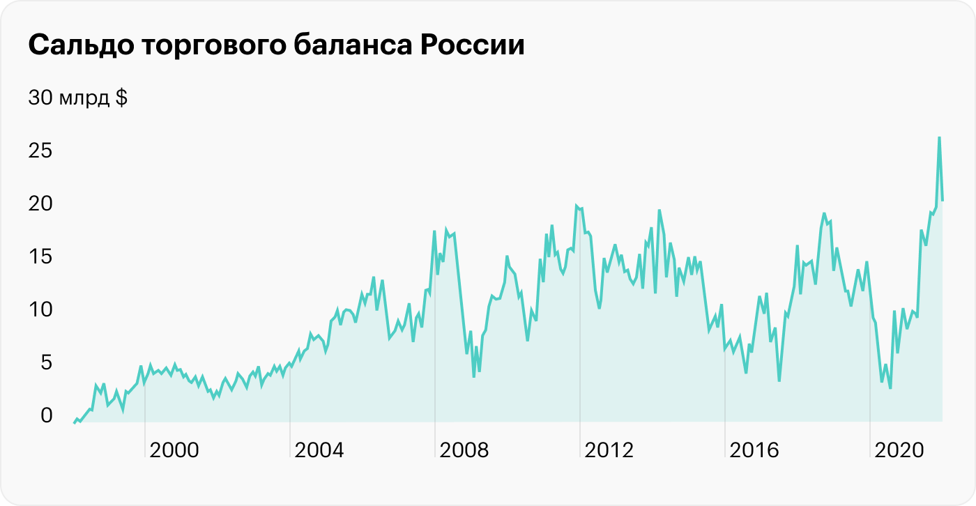 У России стабильно положительный торговый баланс на протяжении 25 лет. Это означает, что рост доли платежей за российский экспорт в рублях будет поддерживать валютный курс. С другой стороны, стабильный поток поступлений в страну может вызывать повышенную инфляцию, с которой придется бороться повышением ставок, что будет ограничивать экономический рост.