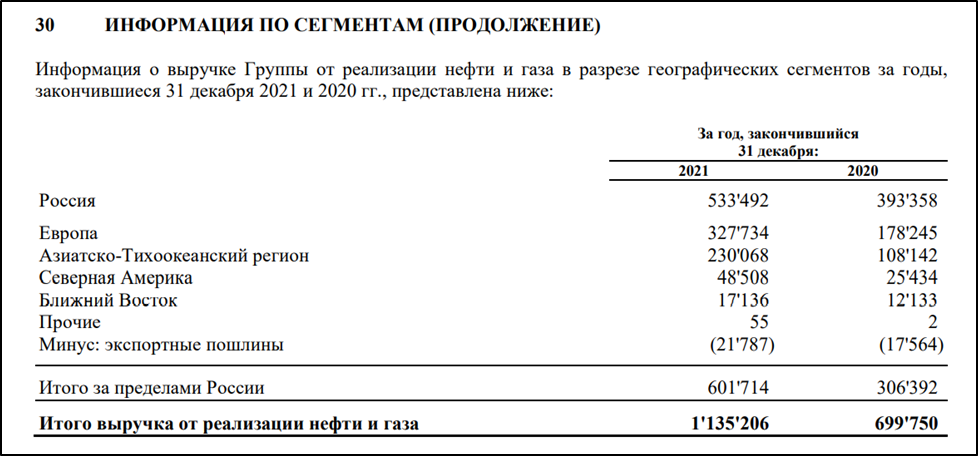 Чтобы понять на чем зарабатывает Новатэк, посмотрим на бизнес модель компании. Так как свежей информации нет, то возьмем данные за 2021 год. Видим, что кроме нефтепродуктов, остальные углеводороды преимущественно реализуются в России.