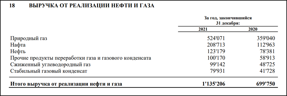Посмотрим на структуру выручки. 524 млрд или 46% выручки приходилось на реализацию природного газа, а 54% или 611 млрд принесли продажи жидких углеводородов (все остальные строки в таблице).