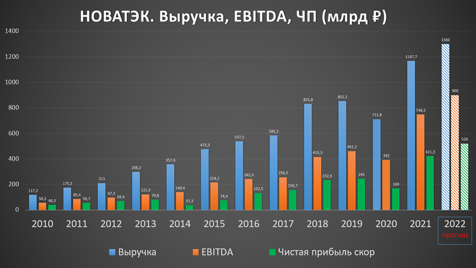 Новатэк исторически имеет растущую динамику финансовых показателей. Единственный сбой был в 2020 году, но он обусловлен коронавирусом, когда из-за локдаунов и прочих мероприятий, спрос и цены на углеводороды резко упали.
