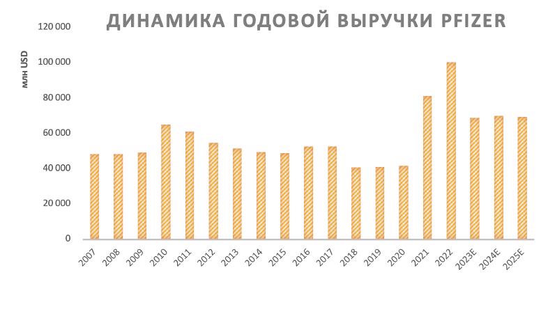 По мере ослабления и завершения пандемии потоки выручки от Comirnaty и Paxlovid в перспективе 3–5 лет после резкого снижения стабилизируются на определенном уровне, в районе $ 10–15 млрд, и к допандемийным уровням выручка фармгиганта уже не вернется.