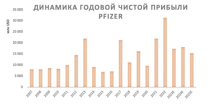 Годовая выручка Pfizer за последние полтора десятилетия демонстрировала неоднородную динамику. В 2021 году был зафиксирован взрывной рост выручки благодаря эффекту вакцины от коронавируса, в 2022 году стремительный рост продолжился за счет той же вакцины и таблеток от ковида. В 2022 году выручка компании в соответствии с нашими ожиданиями перешагнула отметку $ 100 млрд. Аналогичные тенденции справедливы и для динамики чистой прибыли Pfizer. В 2023 году ожидается снижение обоих показателей, а в 2024–2025 гг. они стабилизируются на уровнях, существенно превышающих допандемийные.