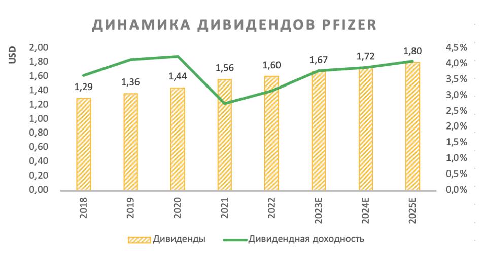 Стоит отметить, что компания выплачивает дивиденды 33 года подряд, при этом стабильно повышает их с 2009 года. Дивидендная доходность Pfizer (2023E) составляет 3,8%.