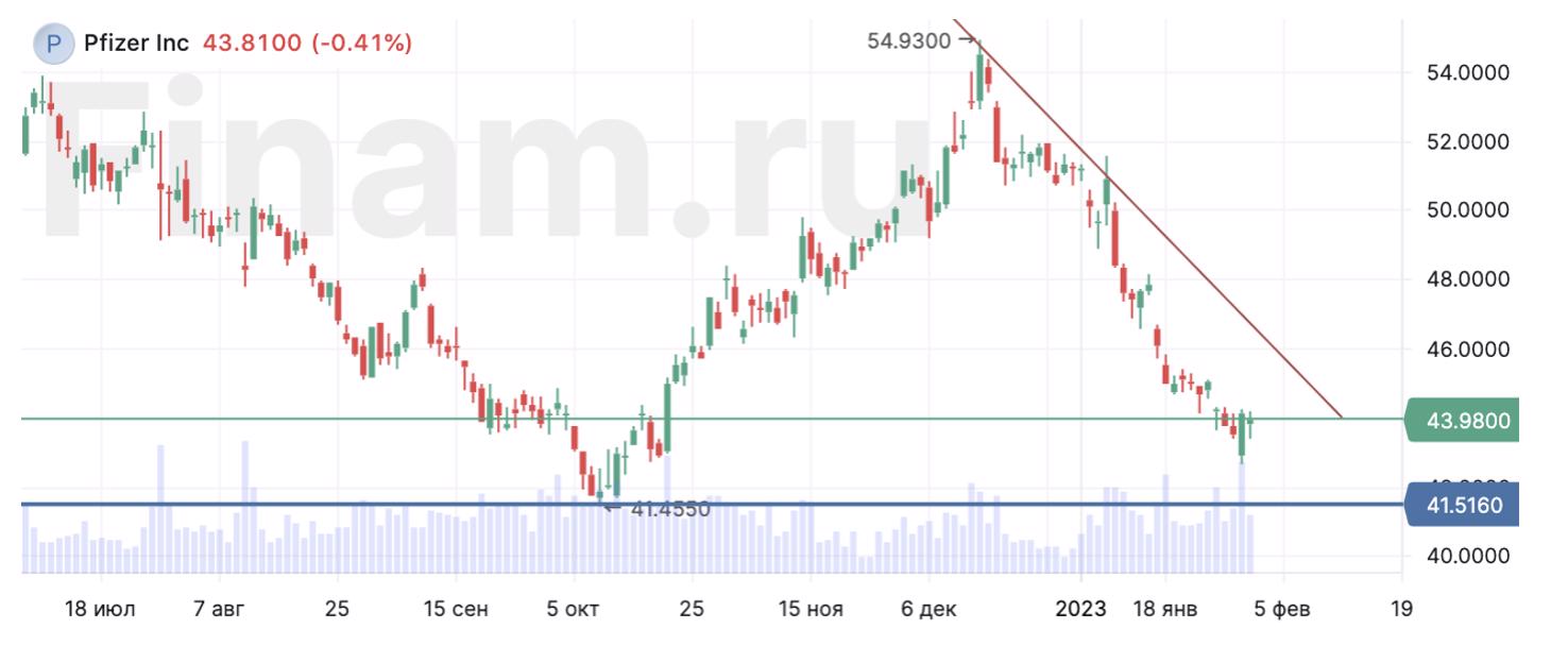 На дневном графике Pfizer формируется среднесрочный нисходящий тренд, при этом цена близка к значимой поддержке 41,5 и может отжаться от нее в ближайшие недели с перспективой разворота вверх.