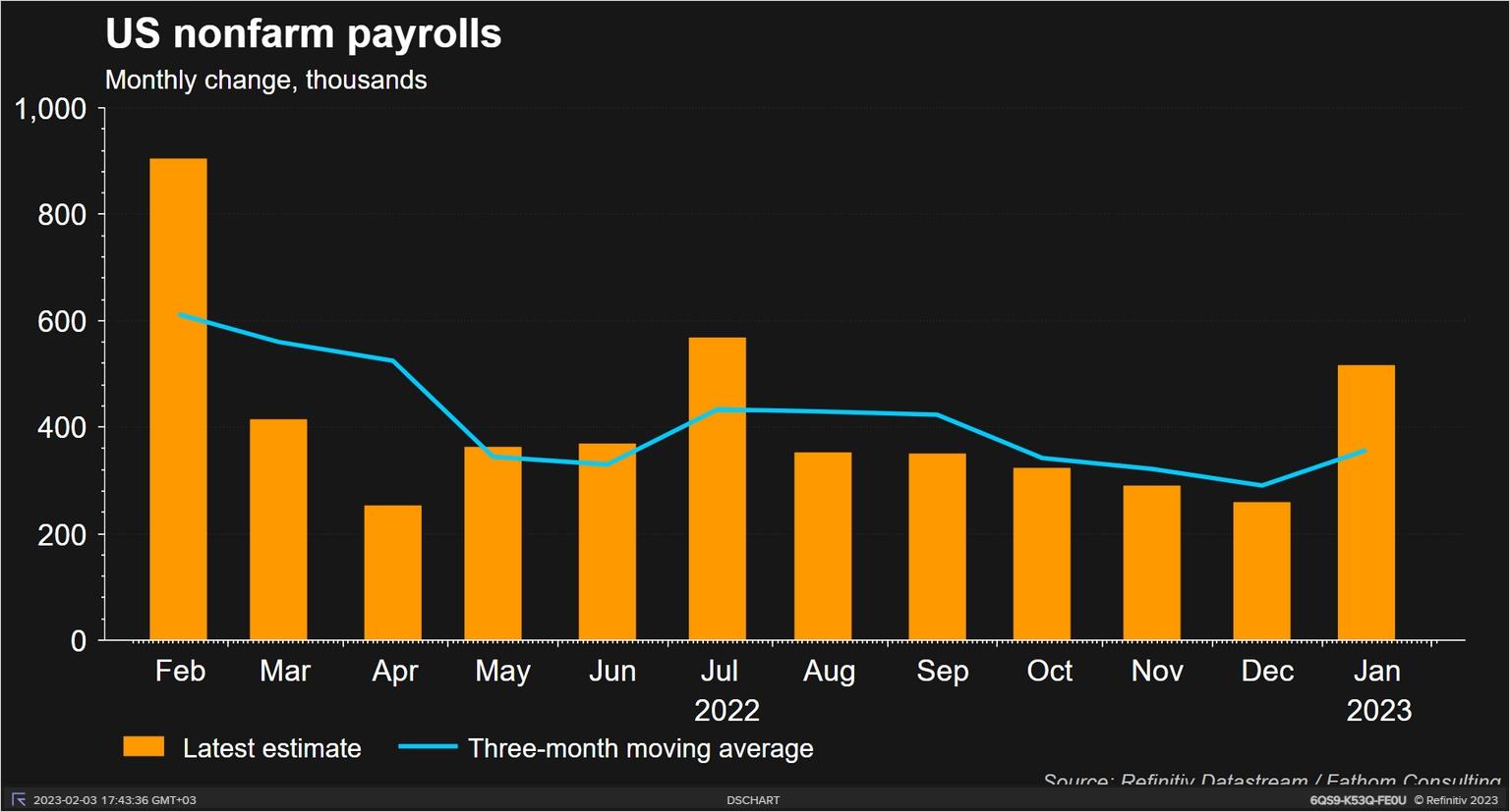 Ситуация особенно контрастирует с массовыми корпоративными увольнениями. По данным рекрутинговой фирмы Challenger, Gray & Christmas, американские компании в январе объявили о сокращении числа рабочих мест на 102,9 тыс., что является максимальным показателем для этого месяца с 2009 года, и в целом максимальным с сентября 2020 года. Наибольшее число объявлений о сокращениях пришлось на технологический сектор, ритейл и финансовый сектор. Возможно, мы увидим эти данные в отчетах по рынку труда в последующие месяцы.