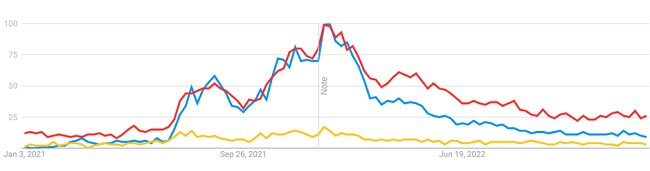 Такой график создает иллюзию быстрого роста интереса к NFT. Однако проверка с использованием свежей статистики Google Trends показывает угасающую динамику.
