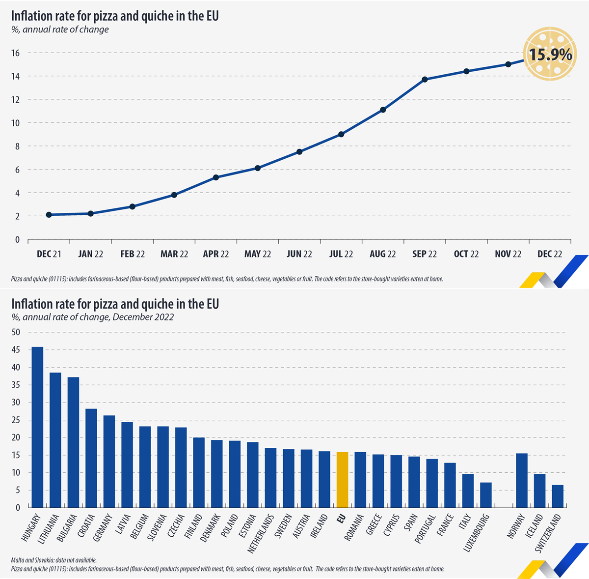 Данные за декабрь 2022 показывают, что цена магазинной пиццы и пирога с заварным кремом в ЕС была в среднем на 16% выше, чем в декабре 2021. А вот в декабре 2021 она была на 2% выше, чем в декабре 2020.