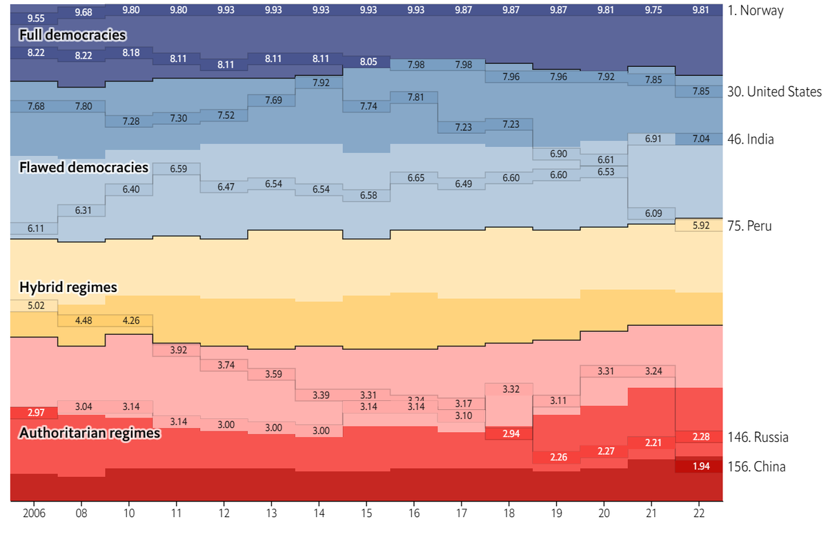Смотрел я на дивную карту и ловил себя на мысли. Где-то я её видел. Точно! Практически точно также разделились страны, которые в 2022 показали более менее живенькие экономические и социальные результаты, ну там инфляция со ставками не совсем на луну и вот это вот всё. Вот эти несвободные без плюрализма государственные образования оказались живенькими. Я уж думал, может вот сейчас, вот чуть ниже The Economist поднимет этот вопрос и расскажет, отчего так получается. Но нет. Главных вопросов у свободного мира два.