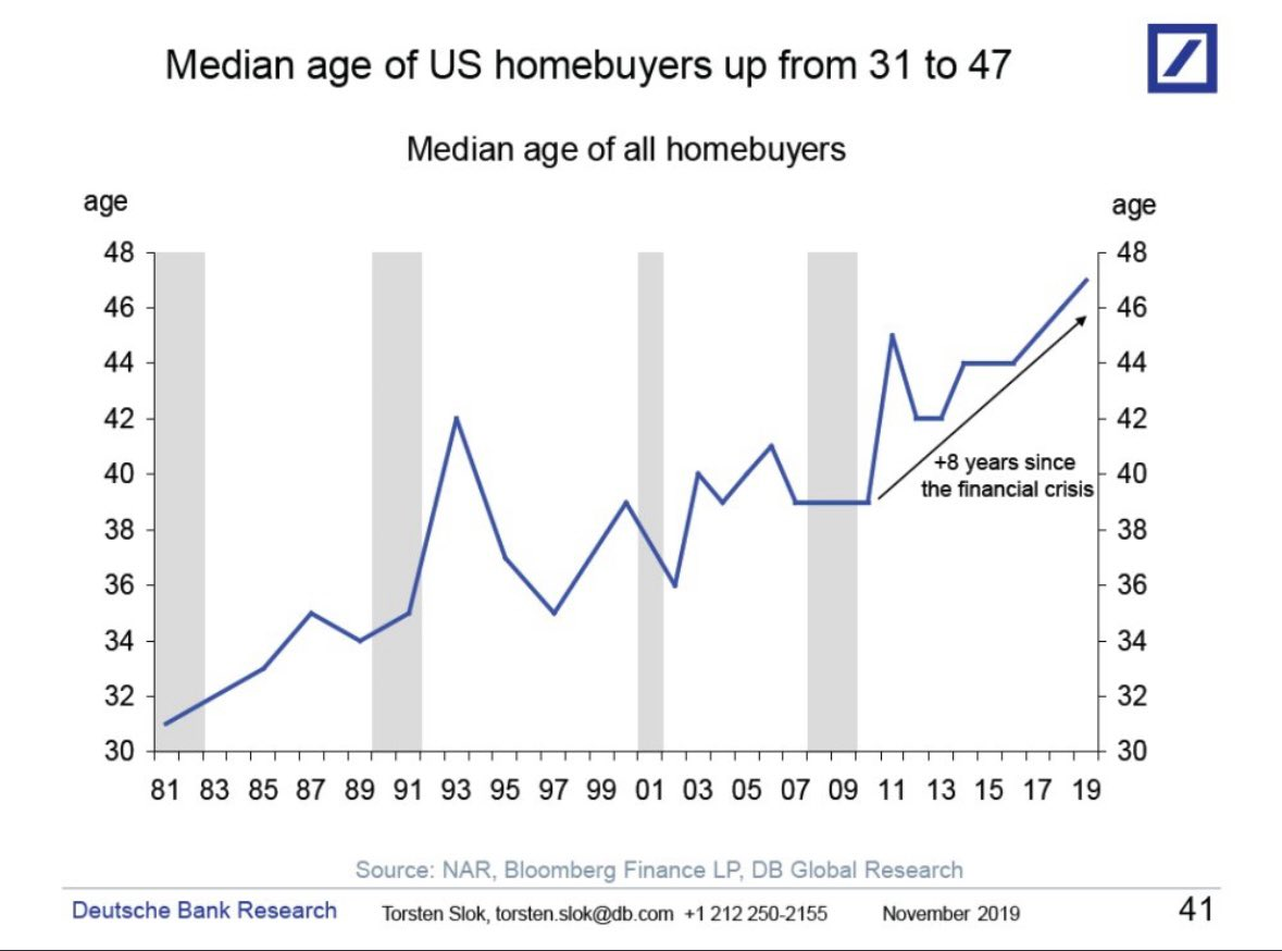 Вот, что по этому поводу насчитал ДойчеБанк. Медианный возраст американского покупателя недвижимости вырос с 31 года до 47 лет. Это за период 1981-2019. А за 8 лет, начиная с мирового финансового кризиса, это показатель вырос на 8 лет! С 39 до 47.