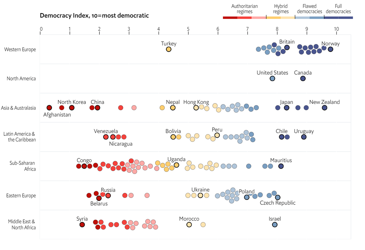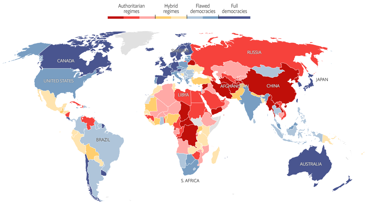 Каждый год исследователи и аналитики The Economist садятся и оценивают, какие страны хорошие, а какие не очень. Далее результаты опубличиваются и доносятся до цивилизованных людей. Инфографика от The Economist как всегда великолепна. Она яркая. Её можно потыкать. Она непредвзята. Ведь ни у кого нет никаких ассоциаций с цветами, правда? Ну разве вам, дорогие друзья, могли прийти в голову какие-то глупые ассоциации красного цвета с... коммунизмом. А может быть с Республиканской партией в США? А синего с Демократической? Ну глупость же...
