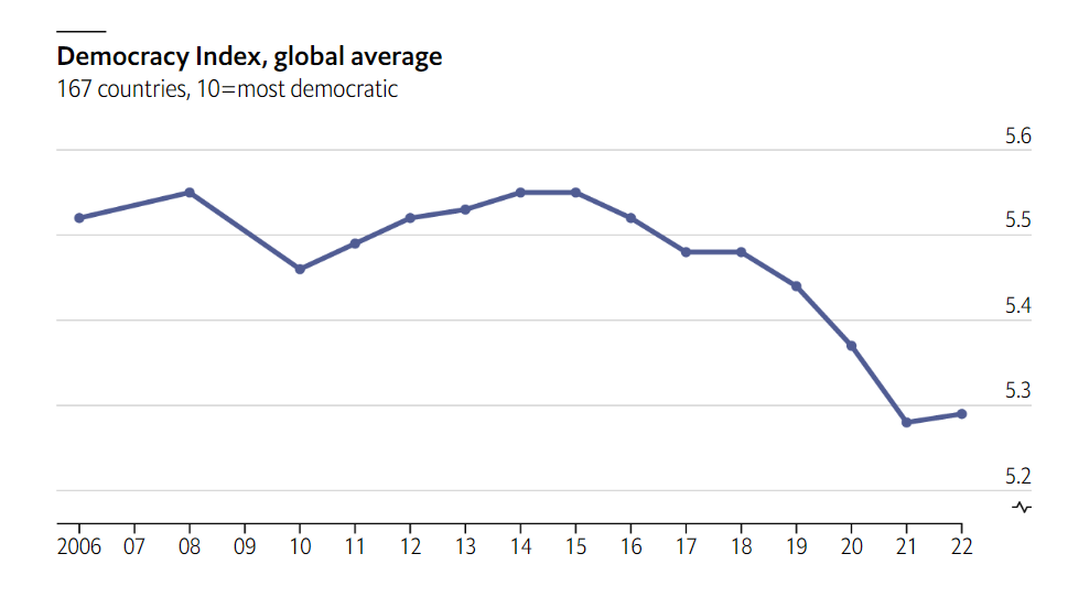 Во-первых, наблюдается тенденция... с 2014 года Индекс начал лить. Еще каких-то 8 лет назад он был выше 5,5. А сейчас? А сейчас ниже 5,3. Уходит... Уходит мир из добрых свободных рук гражданских свобод. И это самое страшное. Ведь это непонятно. Вот здесь мы в Ютубах показываем, как при плюрализме все друг другу улыбаются и спрашивают «как дела»? А вот там мы проводим конкурсы песни, где 30 гендеров поют о равенстве и братстве. Не помогает. Возможно... возможно это в принципе неправильные люди?