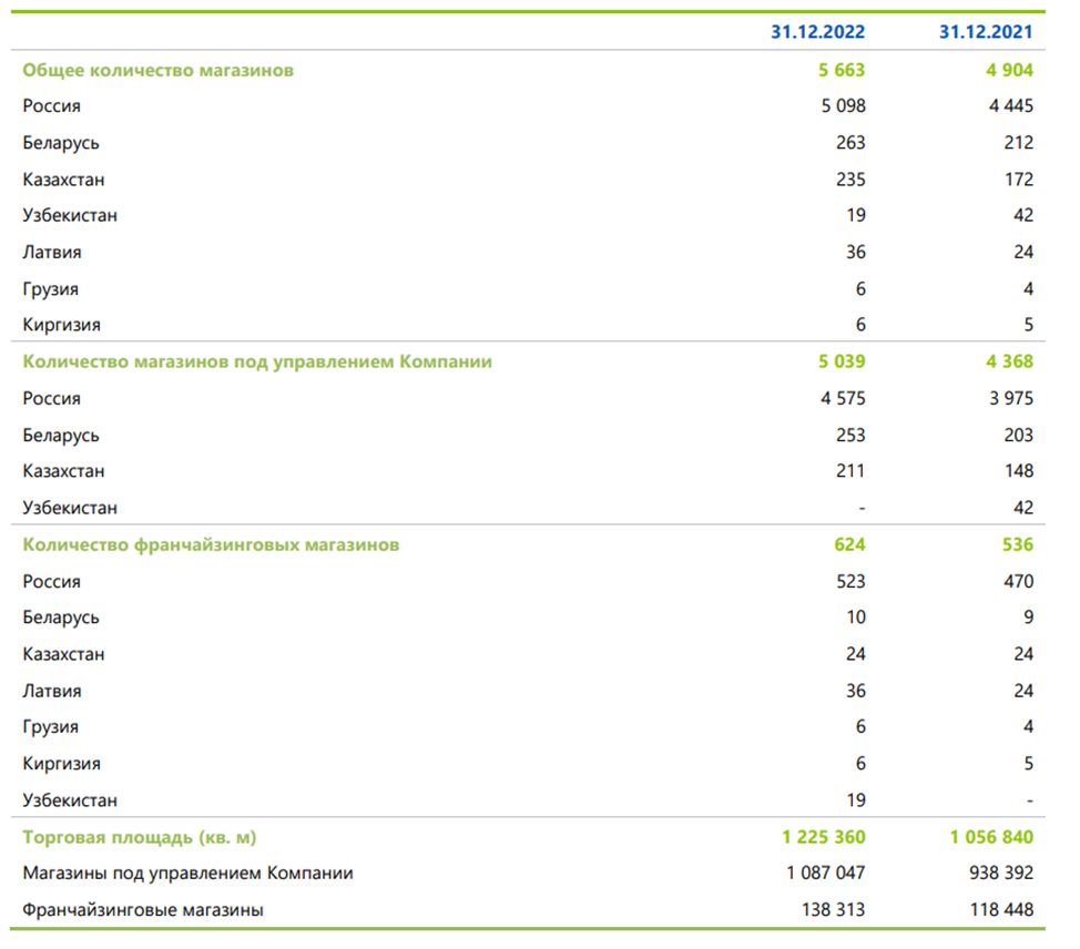 Общая торговая площадь превышает 1,2 млн кв м (+16% г/г). Доля франчайзинговых магазинов составляет 11%.