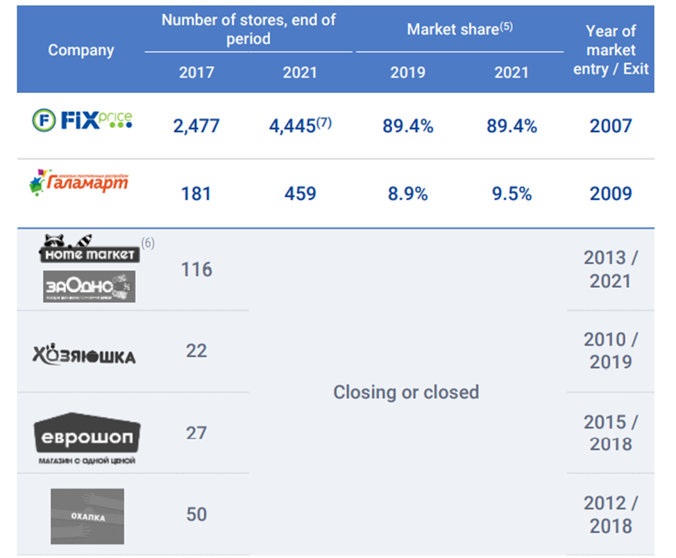 Fix Price позиционирует себя практически монополистом и крупнейшей в РФ сетью магазинов низких и фиксированных цен. Его доля на рынке почти 90%. Единственный прямой конкурент «Галамарт» имеет долю рынка менее 10%.