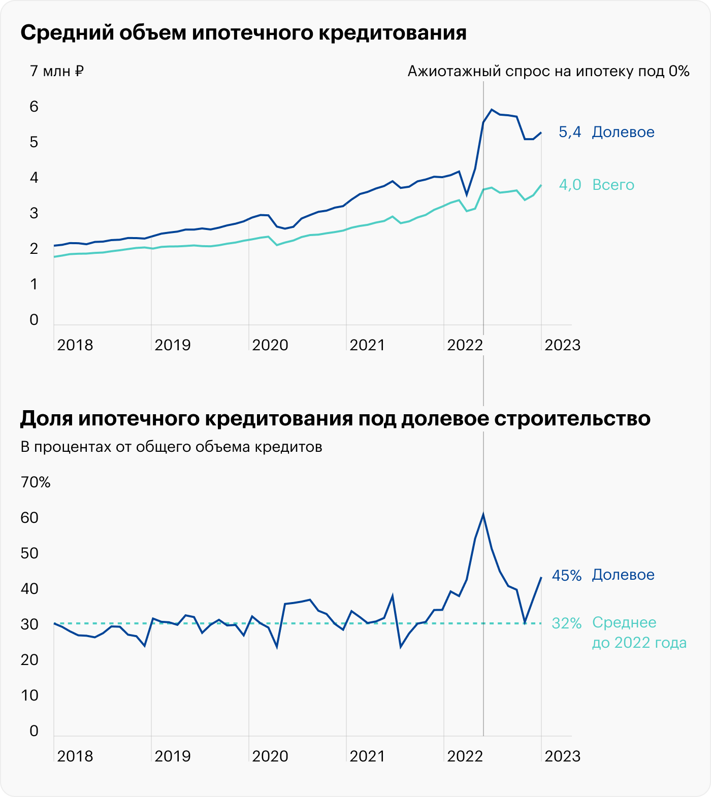 Декабрьский объем кредитов стал рекордным, потому что увеличился средний размер ипотеки. За последний год — на 19%, с 3,3 до 4 млн рублей. Так получилось потому, что номинальные цены на квартиры выросли в среднем по России. А еще дело в большом количестве кредитов на долевое строительство. Средний размер такого кредита за 2022 год вырос больше рынка — на 30%, с 4,2 до 5,4 млн рублей.