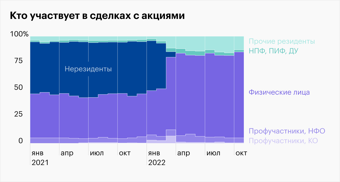 По данным ЦБ, доля физических лиц в торговых оборотах на рынке акций выросла до 80%, а в некоторых бумагах второго и третьего эшелонов достигает 90—100%. При этом доля нерезидентов, которые ранее часто занимали противоположные российским «физикам» позиции при торговле, рухнула практически до нуля.