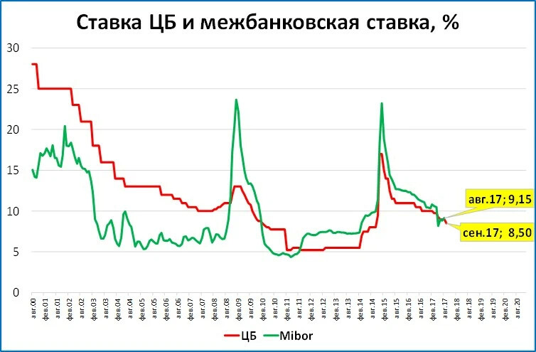 С одной стороны, межбанковские ставки сейчас не могут оторваться сильно вниз от ключевой (нет смысла давать другому банку в долг под 5%, если можно в ЦБ разместить под 6,5%). А в 1999-2008 годах ЦБ такими возможностями размещения банки не баловал, поэтому ставки межбанка бывали значительно ниже ставки рефинансирования ЦБ (см. график). Причём это происходило в годы экономического роста.