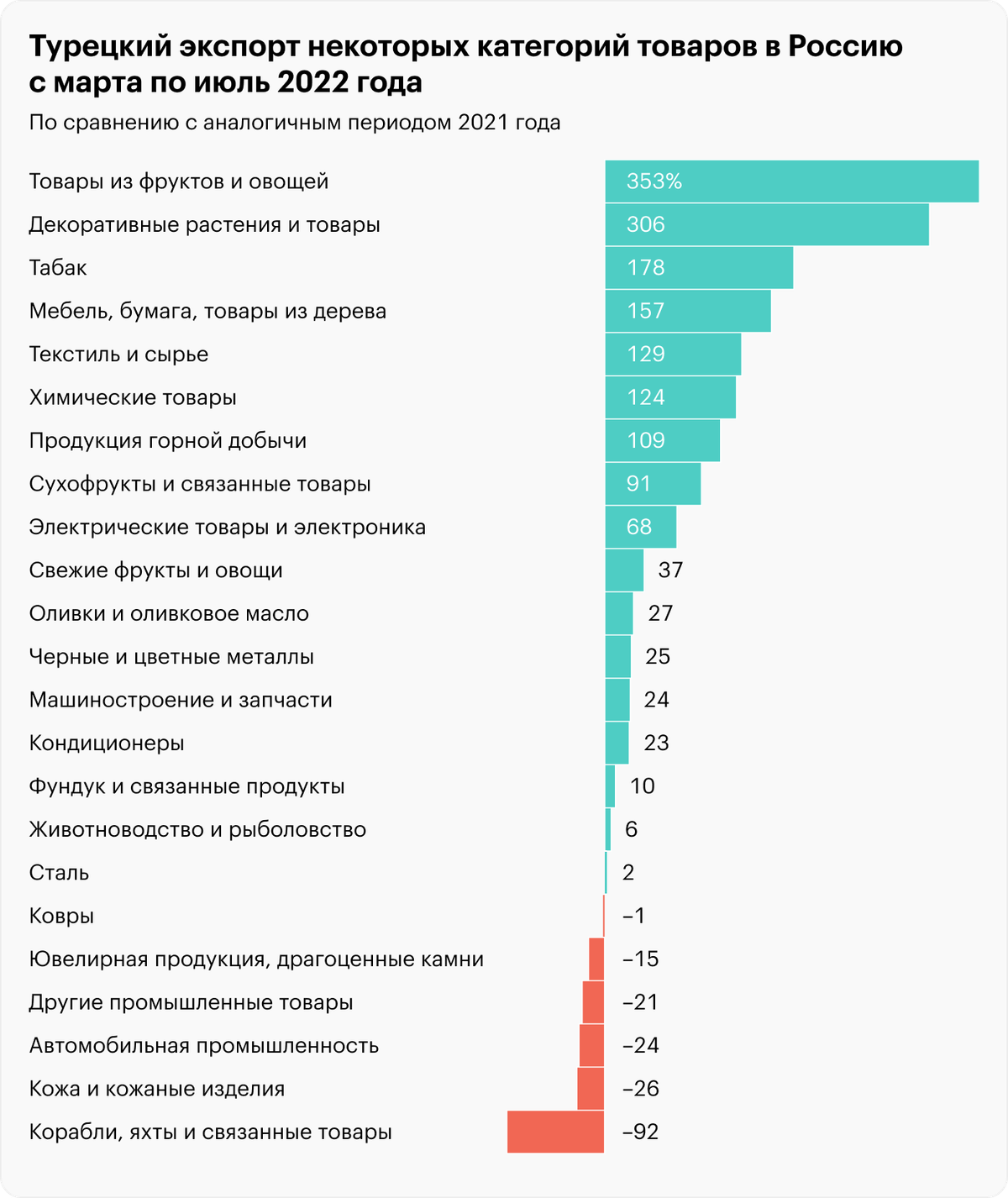 В 2021 году в структуре импорта из Турции в Россию самыми крупными позициями были фрукты и орехи — 1,122 млрд долларов — и «реакторы ядерные, котлы, оборудование и механические устройства» — 0,981 млрд.