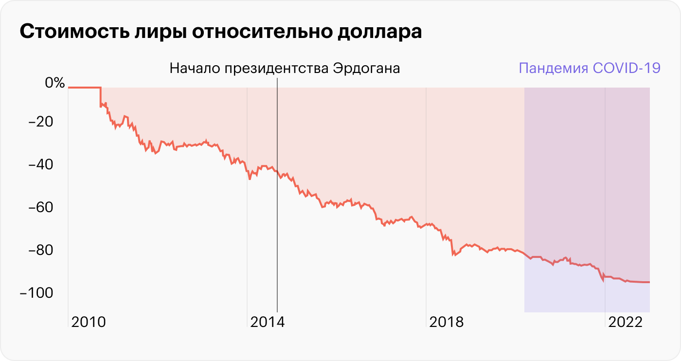 В Турции очень высокая инфляция — сейчас она превышает 50%, — и дальнейшее падение лиры, скорее всего, продолжится. Дальнейшее ослабление турецкой лиры придаст сил турецким экспортерам: с низкой стоимостью валюты их продукция будет более конкурентоспособной. Для тех, кто живет в Турции, но зарплату получает не в лирах за пределами Турции, ослабление лиры может привести к увеличению покупательной способности.