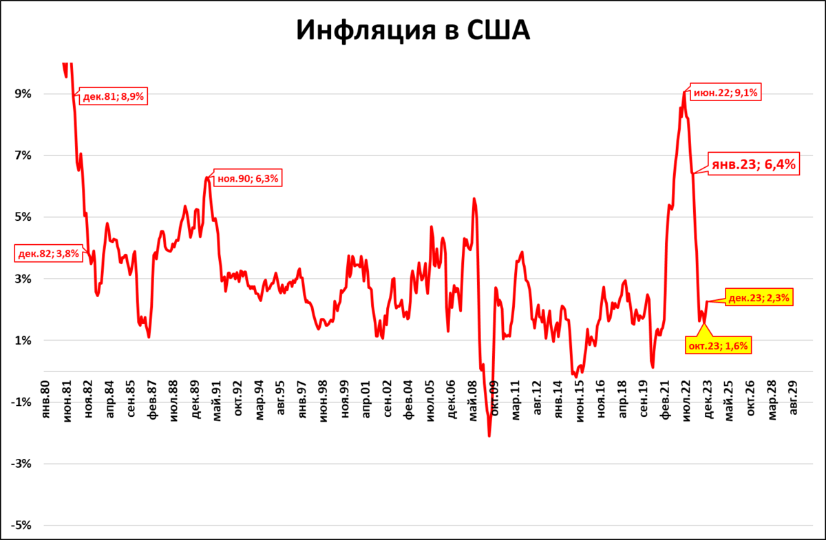Инфляция в США в январе снизилась до 6,4% (6,5% месяц назад).