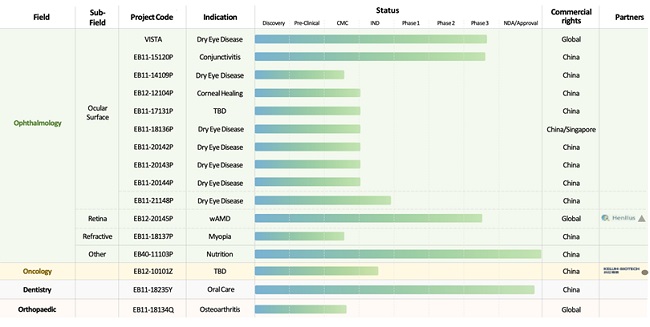 Помимо препаратов для лечения глазных заболеваний Beifushu и кожных средств Beifuji, в линейке Essex Bio присутствуют глазные капли тобрамицина, левофлоксацина, моксифлоксацина и гиалуроната натрия, а также стоматологический гель Carisolv, жидкость для полоскания рта Dr. YaDian, капсулы с йодированным лецитином и гранулы Yi Xue An.