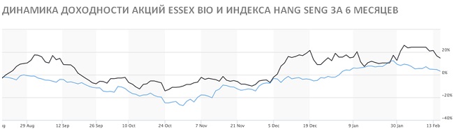 Акции Essex Bio за последние 6 месяцев опережают гонконгский фондовый индекс Hang Seng по доходности — подорожали на 16% в сравнении с прибавкой 3% индекса Hang Seng.