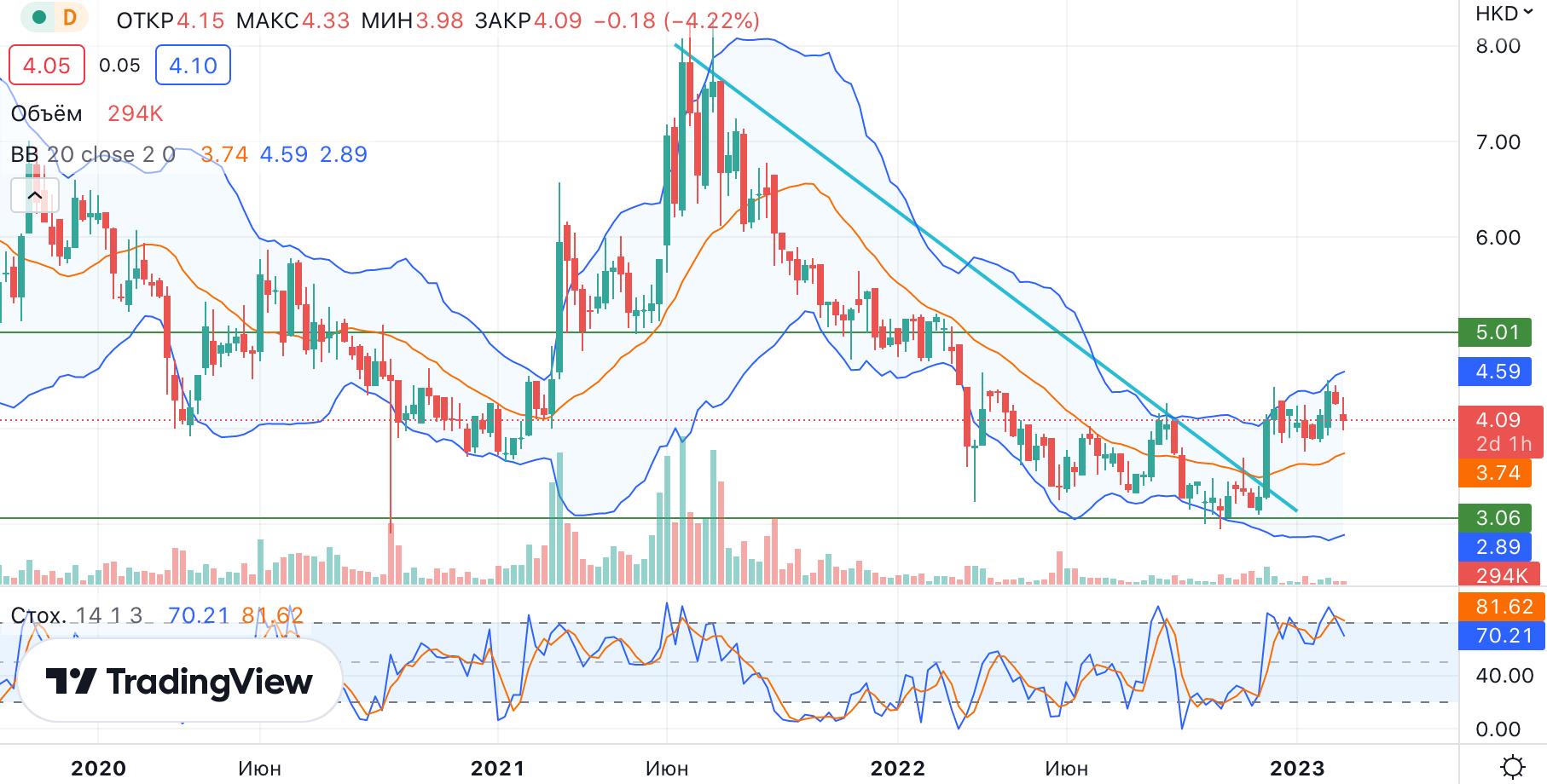 На недельном графике акций Essex Bio в октябре 2022 года цена отжалась от дна на уровне 3,1, а в декабре пробила долгосрочный нисходящий тренд вверх. В среднесрочной перспективе коррекционный отскок бумаги может получить продолжение. Ближайшее сопротивление расположено на отметке 5,0.