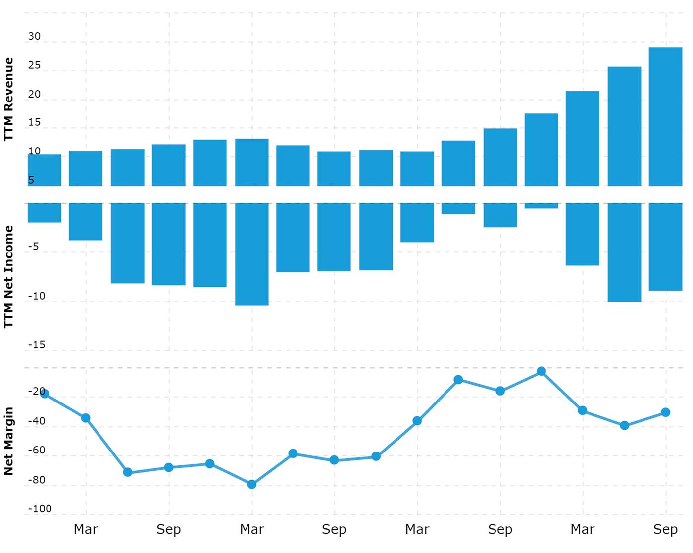 Выручка и прибыль Uber за последние 12 месяцев в миллиардах долларов, итоговая маржа в процентах от выручки. Источник: Macrotrends