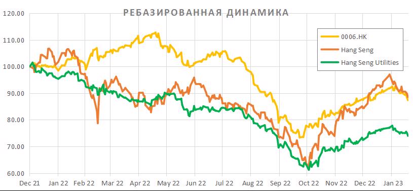 С начала 2022 года акции Power Assets торгуются примерно на одном уровне с Hang Seng, но на графике ниже заметно, как с ноября широкий гонконгский рынок сильно отыграл свое отставание от 0006. С 31 декабря 2021 года акции Power Assets потеряли 13%, Hang Seng — 11%, а отраслевой индекс Hang Seng Utilities — 26%.