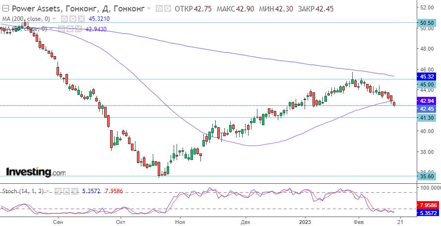 С точки зрения технического анализа на дневном графике акции Power Assets в пятницу пробили вниз 50-дневную скользящую среднюю, что может быть сигналом к продолжению коррекции в ближайшие сессии. Однако потенциал дальнейшего снижения выглядит ограниченным с учетом расположения стохастического осциллятора, в связи с чем котировки могут оттолкнуться от поддержки на HKD 41,3.