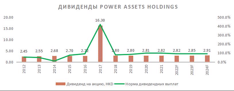 Дивиденды — главный фактор привлекательности Power Assets. На горизонте NTM мы оцениваем дивидендную доходность акций на уровне 6,7%, и это наивысшее значение среди представителей сектора электроэнергетики в индексе Hang Seng. Компания поддерживает высокую норму выплат (около 90%) и периодически выплачивает специальные дивиденды в адрес акционеров.