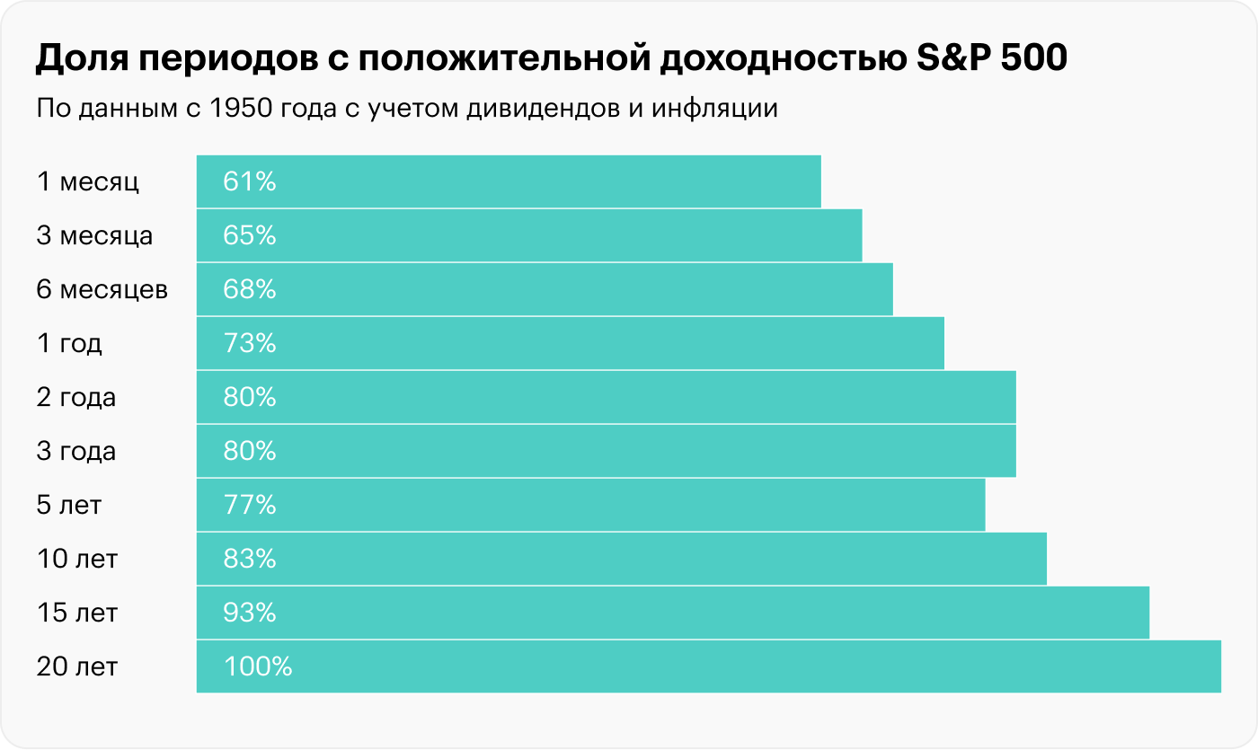 По статистике с 1950 года, S&P 500 на дистанции в месяц дает положительную доходность лишь в 61% случаев. Но на горизонте в 3 года доля таких положительных исходов увеличивается до 80%. А уже на дистанции в 20 лет не было ни одного случая, когда индекс принес бы убыток.