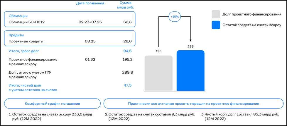 Совокупный долг с учетом проектного финансирования составил 289,8 млрд ₽. Но остатков на счетах эскроу 233 млрд, плюс остаток кэша на счетах 9,3 млрд. Таким образом, чистый долг на конец 2022 года составил 47,5 млрд. ND/EBITDA = 1. Долговая нагрузка умеренная. И у компании есть планы по ее снижению.
