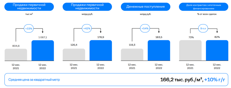 Уверенный рост продемонстрировали и операционные показатели. Новые продажи превысили 1 млн кв метров (+33% г/г) и принесли почти 179 млрд (+42% г/г). 82% всех сделок совершено через ипотеку. Средняя цена превысила 166 тыс ₽/м2 (+10% г/г).