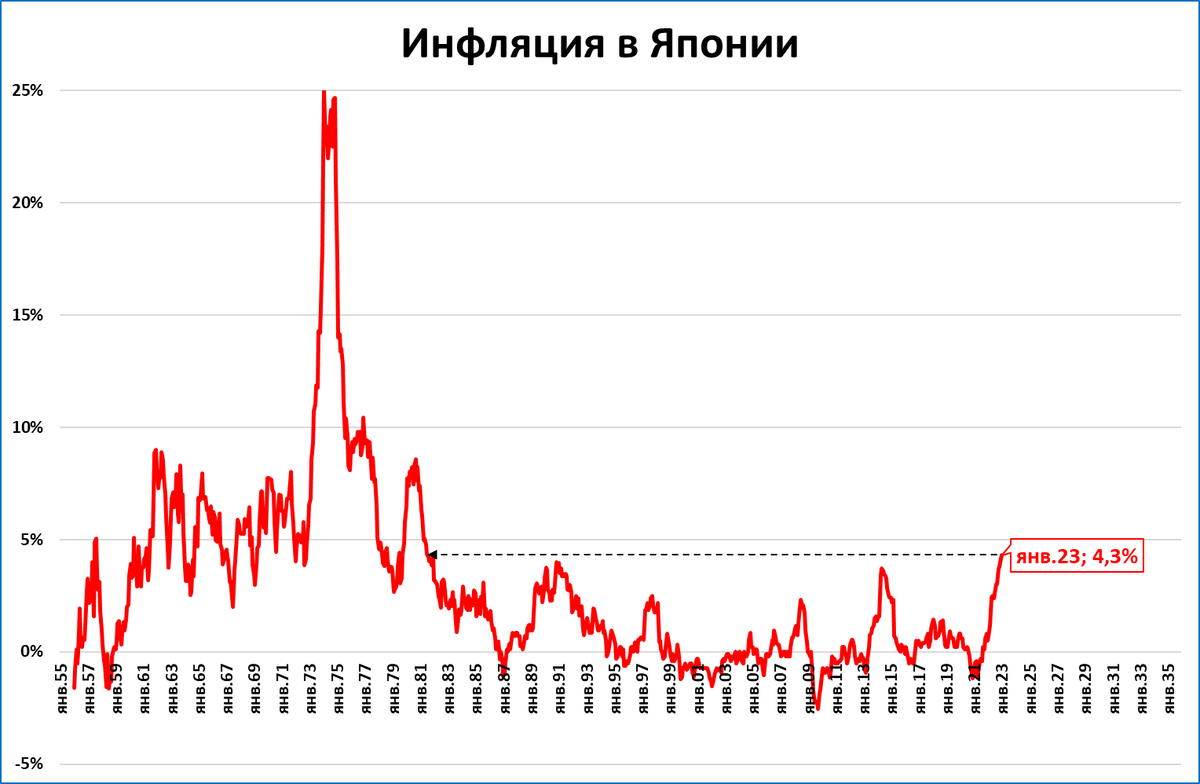 Инфляция в Японии продолжает расти. По итогам января годовая инфляция составила 4,3% – это максимум с 1981 года (42 года).