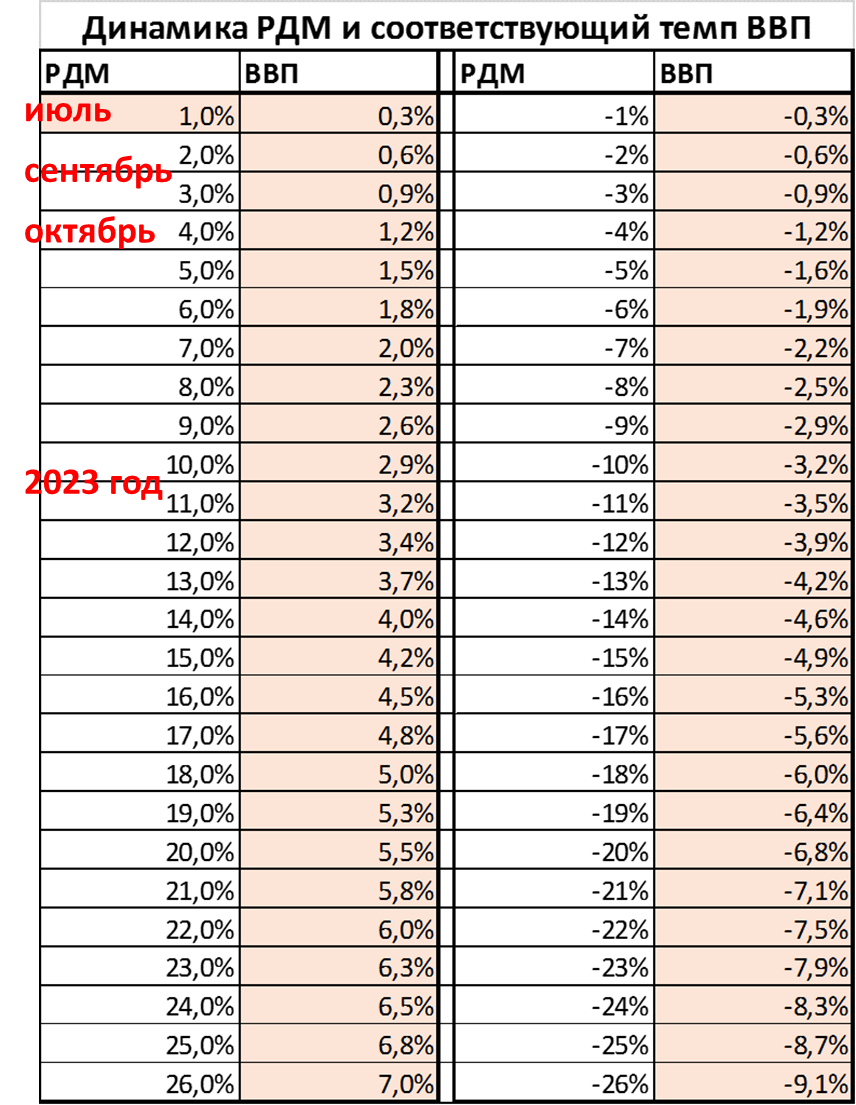 По мере того, как росли ожидаемые темпы реальной денежной массы (РДМ) на конец 2022 года (см. подписи «июль», «сентябрь», «октябрь» в таблице), росли и прогнозируемые нами темпы роста ВВП.