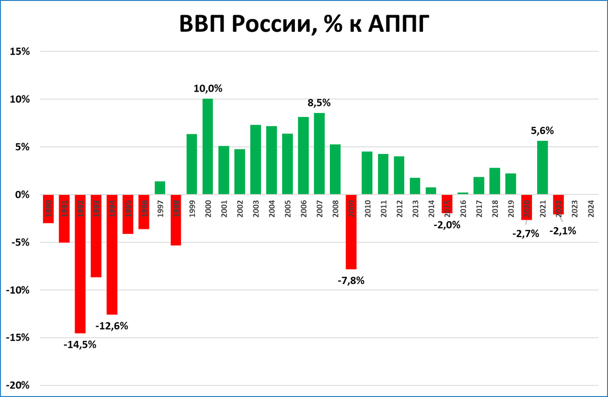 Хорошая аналогия – 1999 год. Из-за внезапной недоступности импорта (из-за девальвации рубля в 4 раза) в экономике в том году происходили резкие структурные изменения. И первые оценки ВВП, сделанные в феврале 2000 года предполагали рост примерно +3%. Позже выяснилось, что ВВП вырос сильнее: +6,4%.