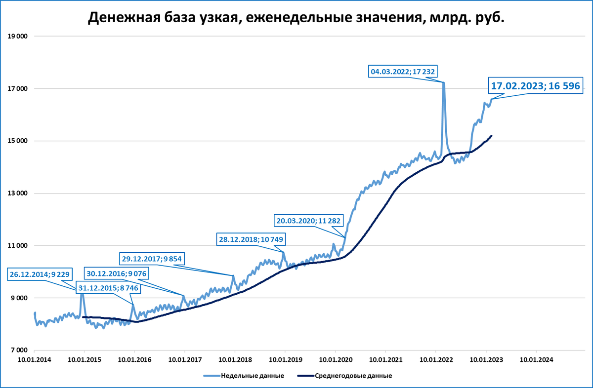 Узкая денежная база (УДБ) на 17 февраля выросла до 16,6 трлн рублей (максимум с марта 2022).