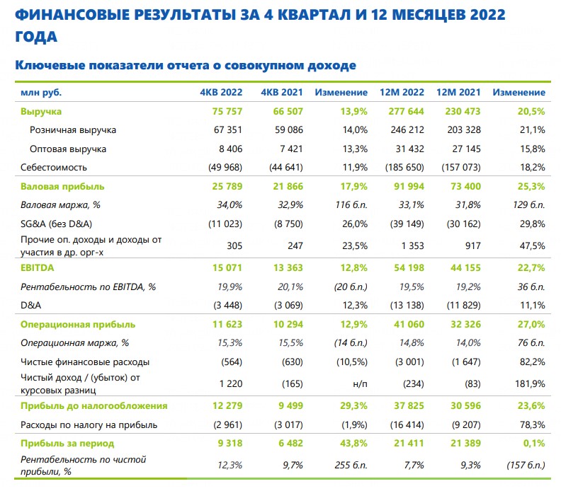Выручка в четвертом квартале выросла на 14% г/г — это самые медленные темпы роста за 2022 год. Отчасти это связано с высокой базой прошлого года, а еще со снижением трафика (в сопоставимых магазинах -4,1% г/г). По итогам всего 2022 года выручка прибавила 20,5% г/г — это немного меньше, чем в 2021-м (тогда было +21,3%). Причины замедления аналогичные — успешный прошлый год и снижение трафика (LFL-трафик -2,5% г/г). Но хочется отметить и позитивные моменты. Во-первых, рост выручки поддержал средний чек, который в сопоставимых магазинах (LFL) увеличился на 14% г/г — это максимум среди отчитавшихся ритейлеров. Это важно, учитывая высокую инфляцию и специализацию Fix Price на продажах недорогих товарах. Во-вторых, компания расширила свою сеть, открыв 759 новых магазинов за год (+15%).