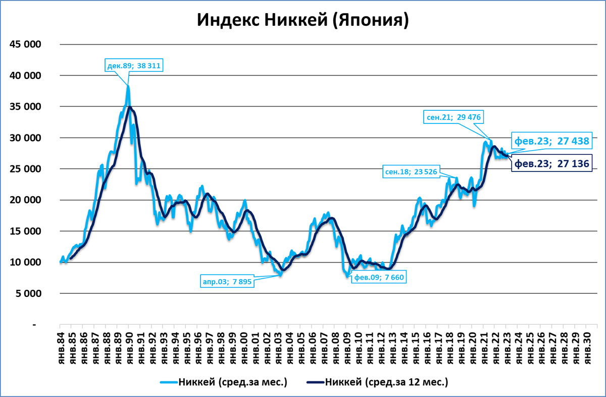 Японский фондовый индекс Nikkei в феврале вырос (+2,7%). Это второй месяц роста за последние 13 месяцев.