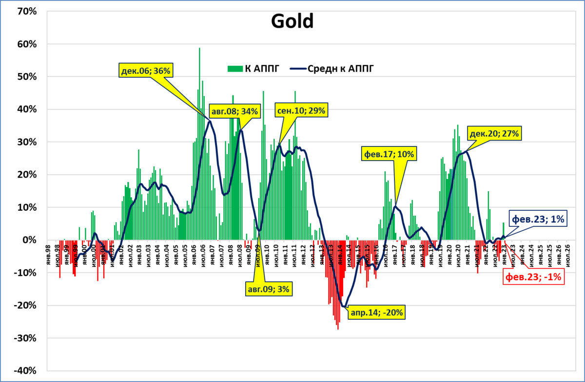 Не считая двух месяцев роста в декабре и январе, цена на золото падает с мая 2022 года. Среднегодовые темпы замедлялись с декабря 2020 года, а с января 2022 года стабилизировались на уровне около 0-1%.