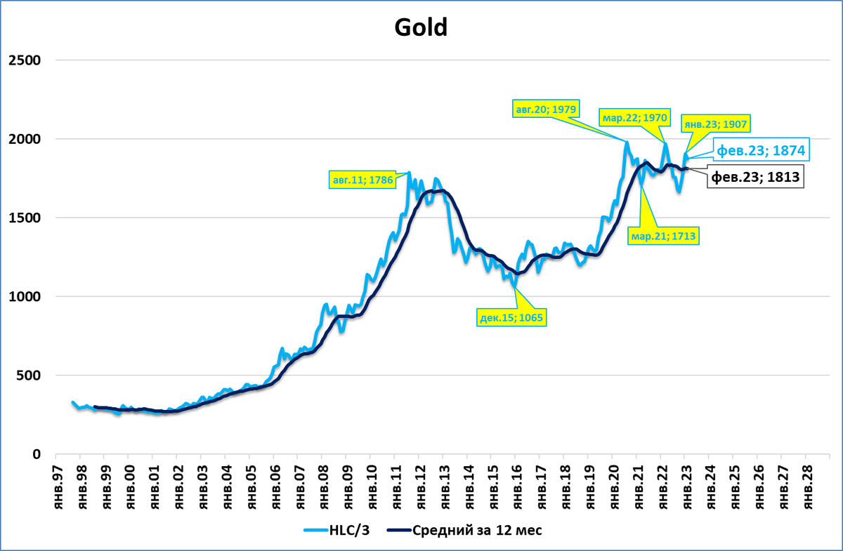 Среднегодовые цены на золото уже больше двух лет находятся возле отметки 1800 долларов за тройскую унцию. В феврале цены были на 1% ниже, чем в феврале прошлого года.
