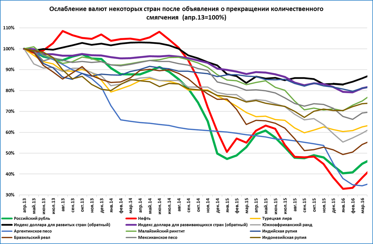Когда ФРС весной 2013 года объявила о предстоящем в 2014 году сворачивании количественного смягчения, валюты развивающихся стран отреагировали на это снижением.