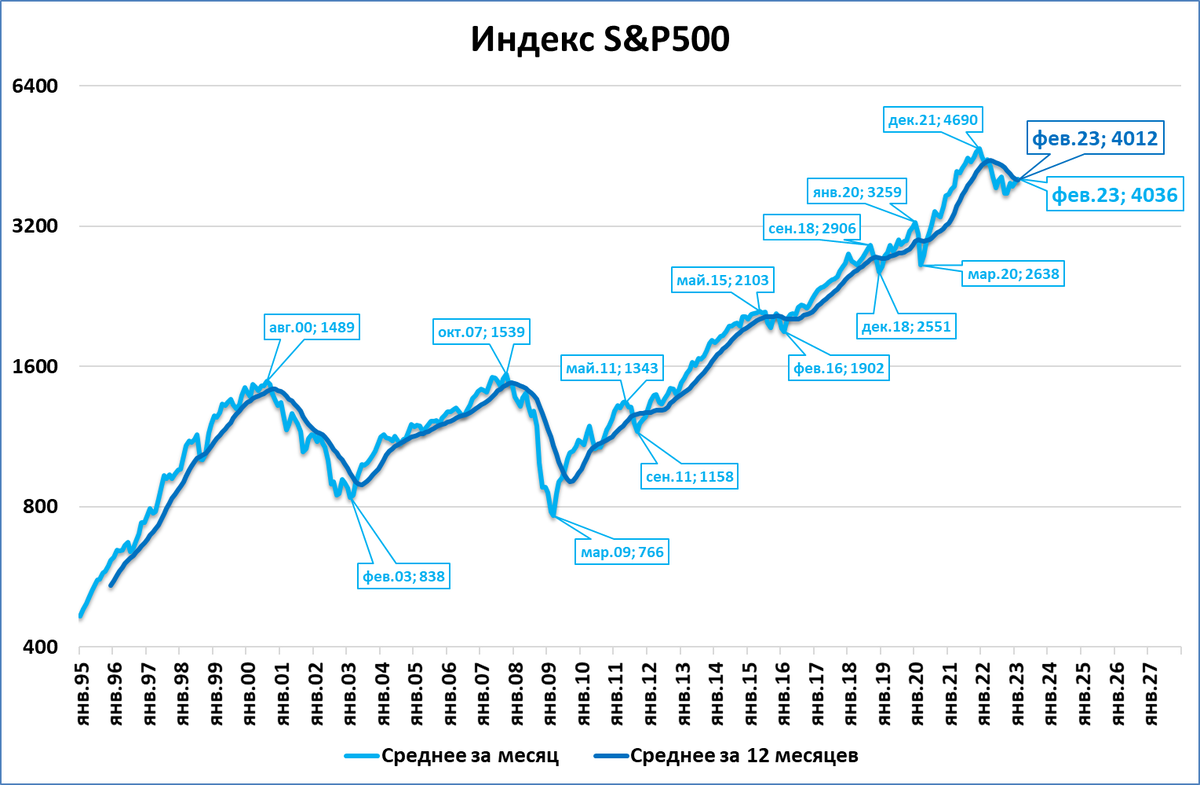Индекс S&P500 в феврале вырос до 4036 пунктов (в январе 3988 пунктов).