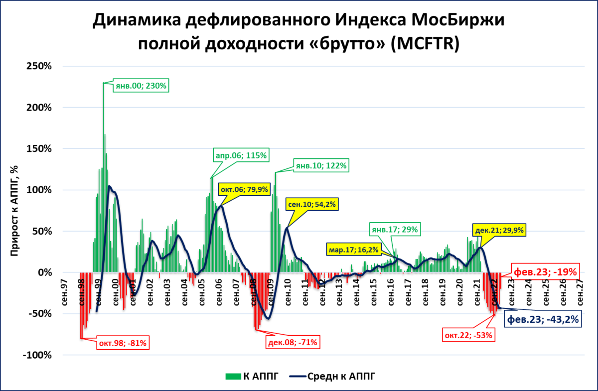 Если учесть дивиденды, выплачиваемые по акциям, а также учесть инфляцию, то по итогам июля такой “реальный индекс полной доходности” Мосбиржи составит 219 пунктов (октябрь 1997 = 100).