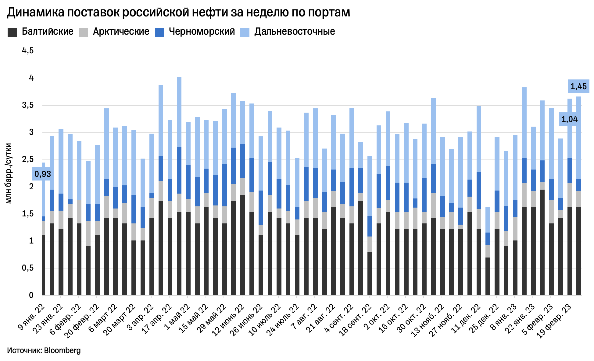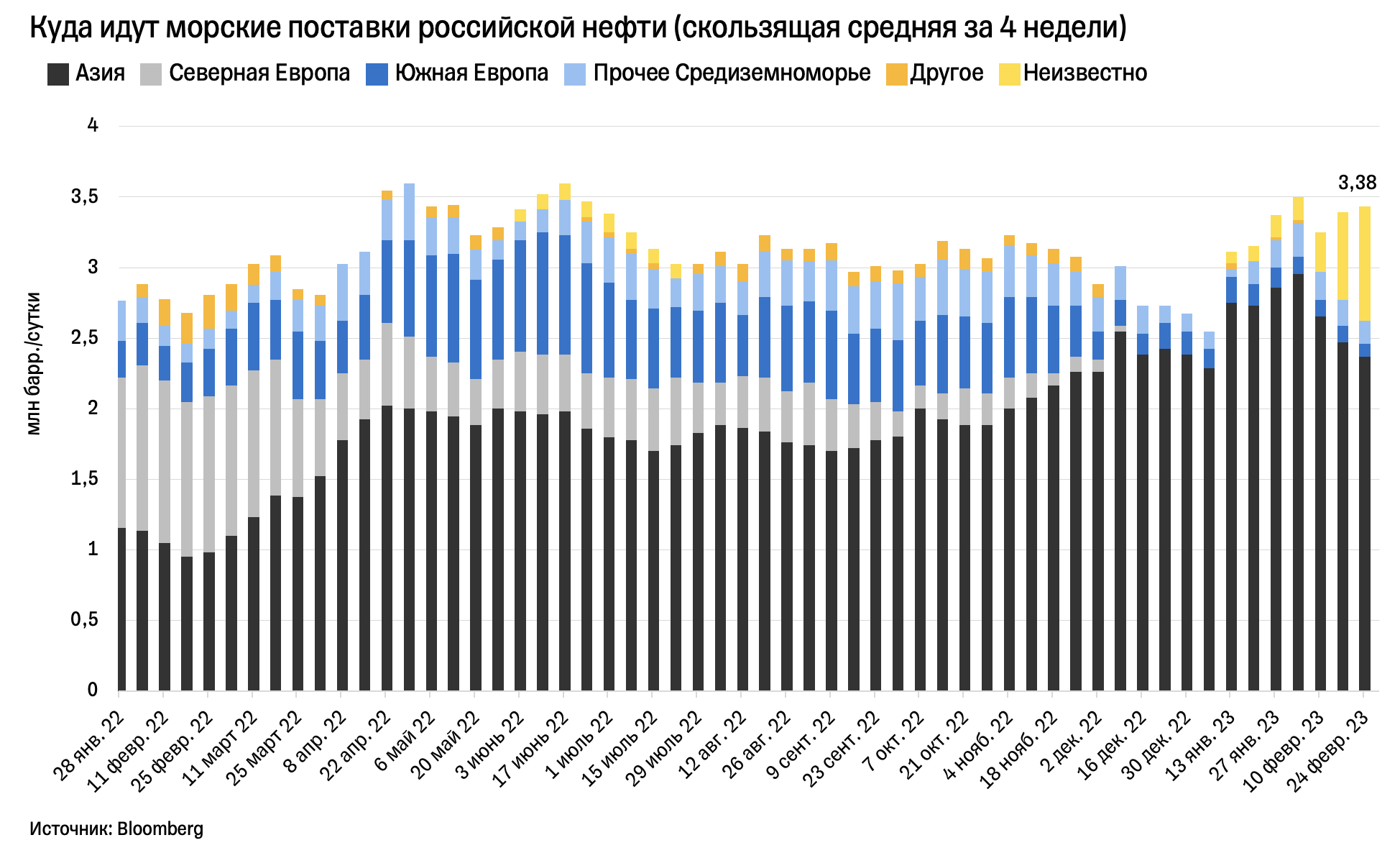 Россия наращивает поставки сырой нефти, и это при том, что с марта она сокращает добычу на 500 тысяч баррелей в сутки в ответ на западные санкции. На прошлой неделе объем российских поставок сырой нефти морем достиг 3,63 млн баррелей в сутки — это на 64% больше, чем за первую неделю 2022 года, и в целом пятый результат за неделю с начала прошлого года, по данным Bloomberg.