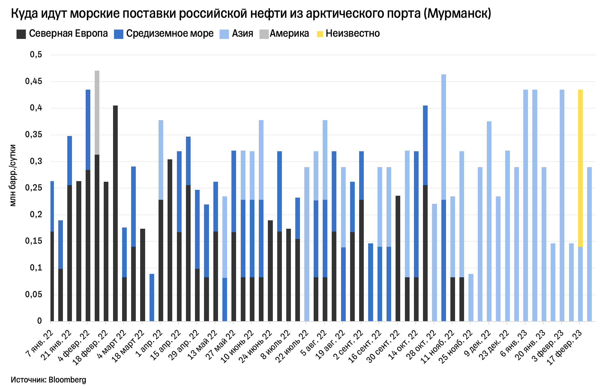 Морских поставок в северную часть Европы с момента введения эмбарго ЕС не было. Получается, что быстрые и более дешевые поставки российской нефти европейским клиентам практически полностью сменились на длинные и более дорогие поставки в Азию.